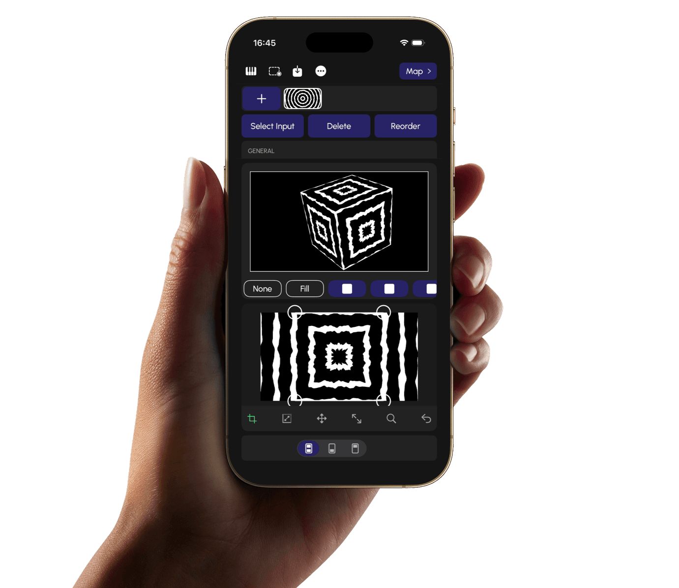 Your projections respond to sound and MIDI in real time. Connect a mic, instrument, or controller and watch the mapping react.